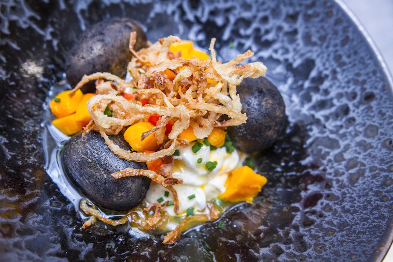Můj signature dish jsou brambory v popelu s uzeným máslem, tvarohem z farmy Krasolesí, fermentovanou sezónní zeleninou a pažitkou.