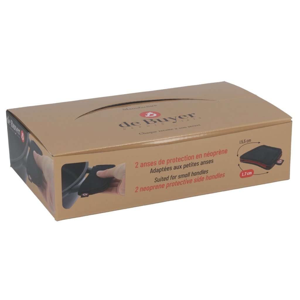 - pár malých neoprenových chňapek de Buyer je určen pro bezpečné uchopení horkých rukojetí hrnců, pánví nebo kastrolů během vaření