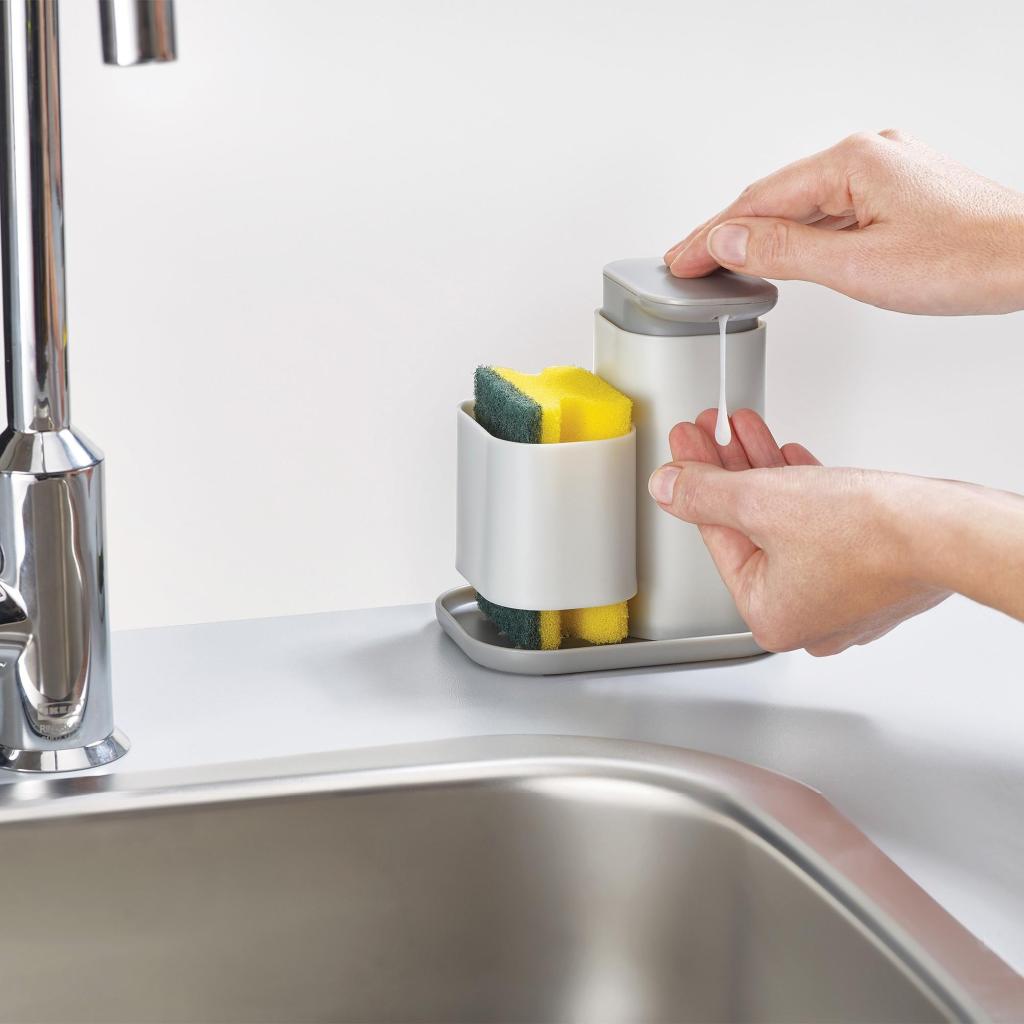 - Praktické spojení dávkovače a držáku houbičky v jednom celku pomáhá minimalizovat nepořádek a přispívá k organizovanému vzhledu prostoru kolem dřezu.