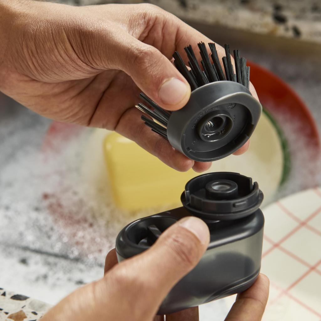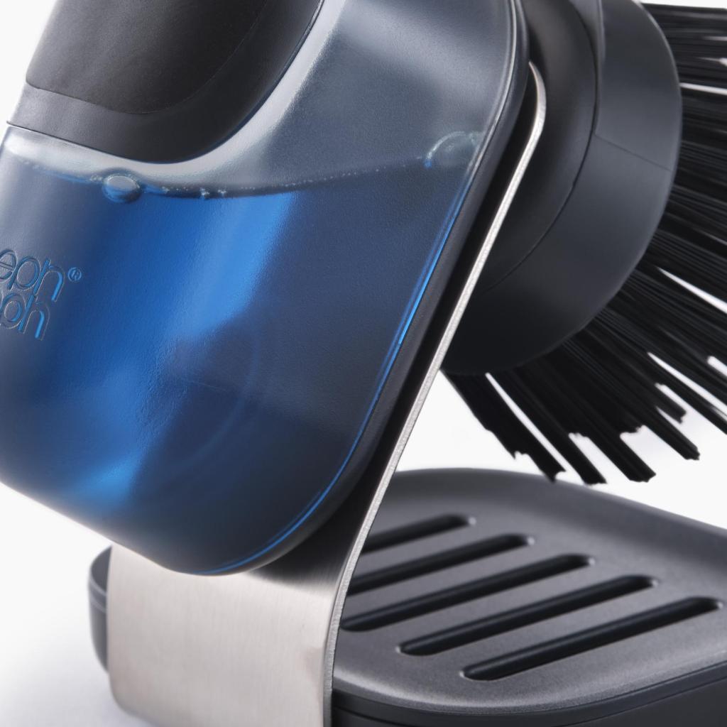 - Stačí jednoduše stisknout horní tlačítko a přesné množství tekutého saponátu se uvolní přímo do štětin pro okamžité a efektivní čištění.