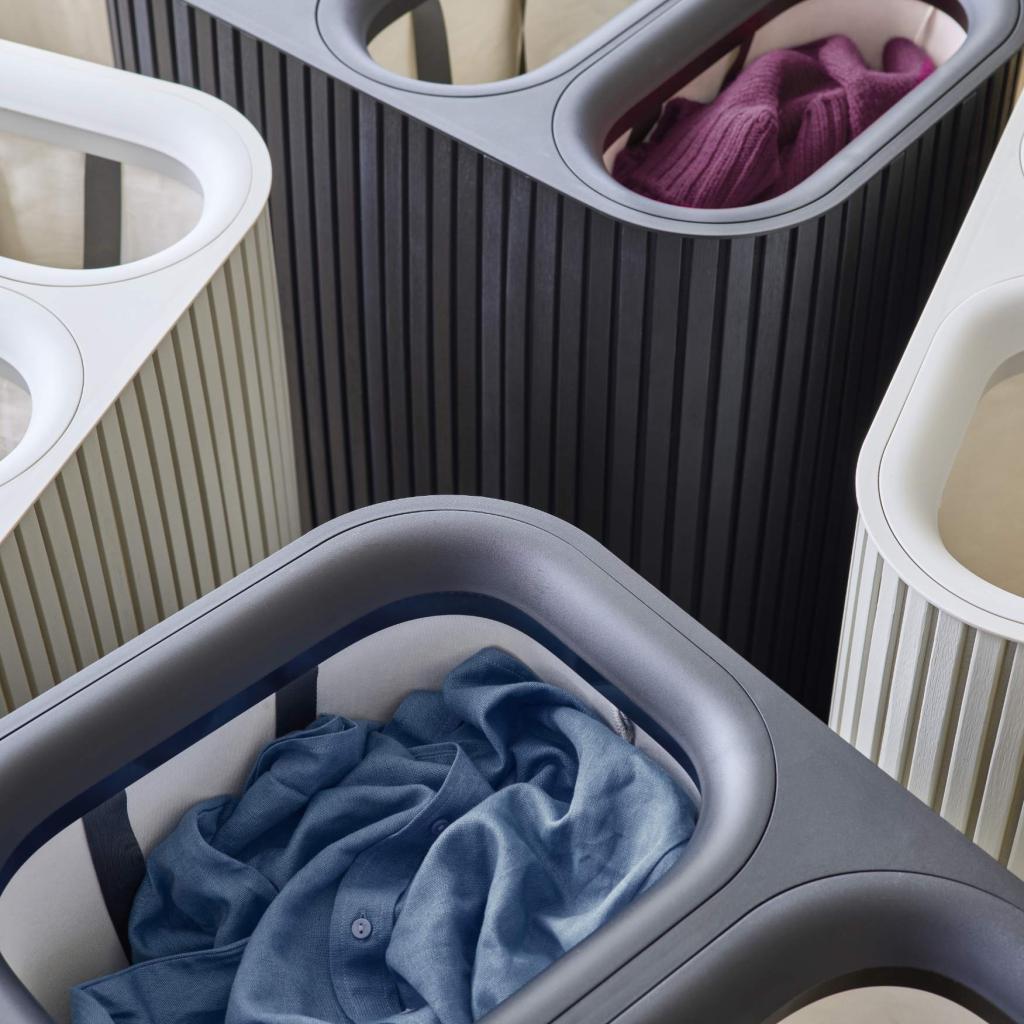 - Vyjímatelné textilní tašky s pevnými uchy umožňují pohodlné přenášení prádla přímo k pračce bez nutnosti přenášet celý koš.