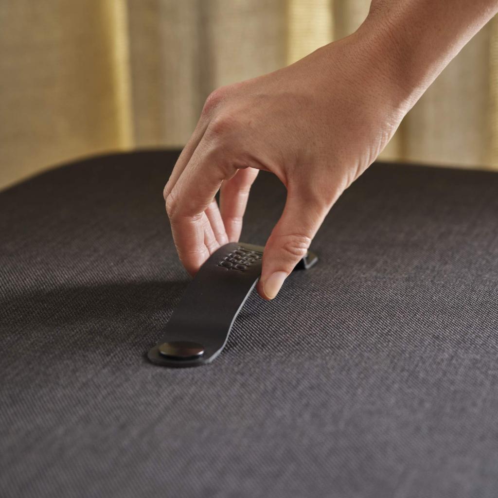 - Víko potažené textilií je doplněno koženým madlem, které usnadňuje manipulaci a zároveň podtrhuje jeho vytříbený design.