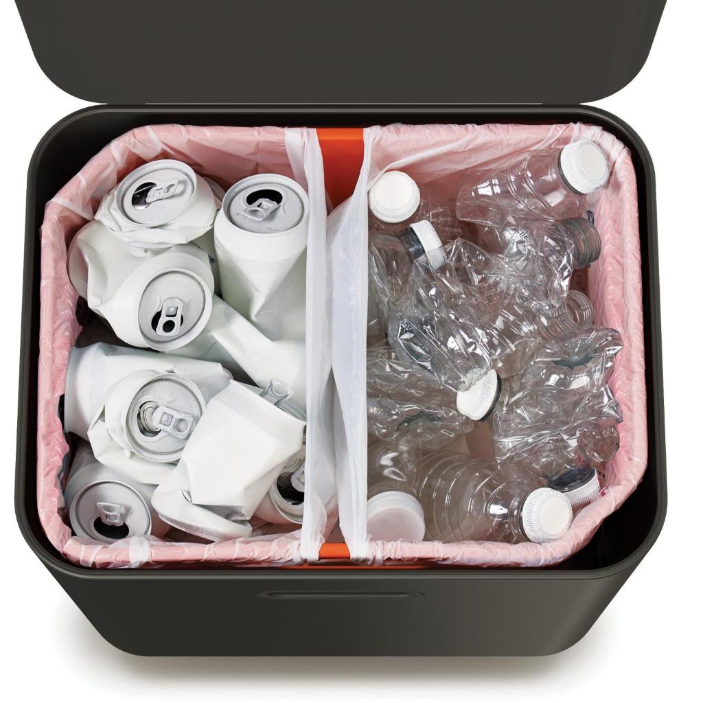 - Dvě hlavní nádoby o objemu 30 litrů umožňují snadné oddělení běžného odpadu a tříděných surovin bez nutnosti dalších košů.