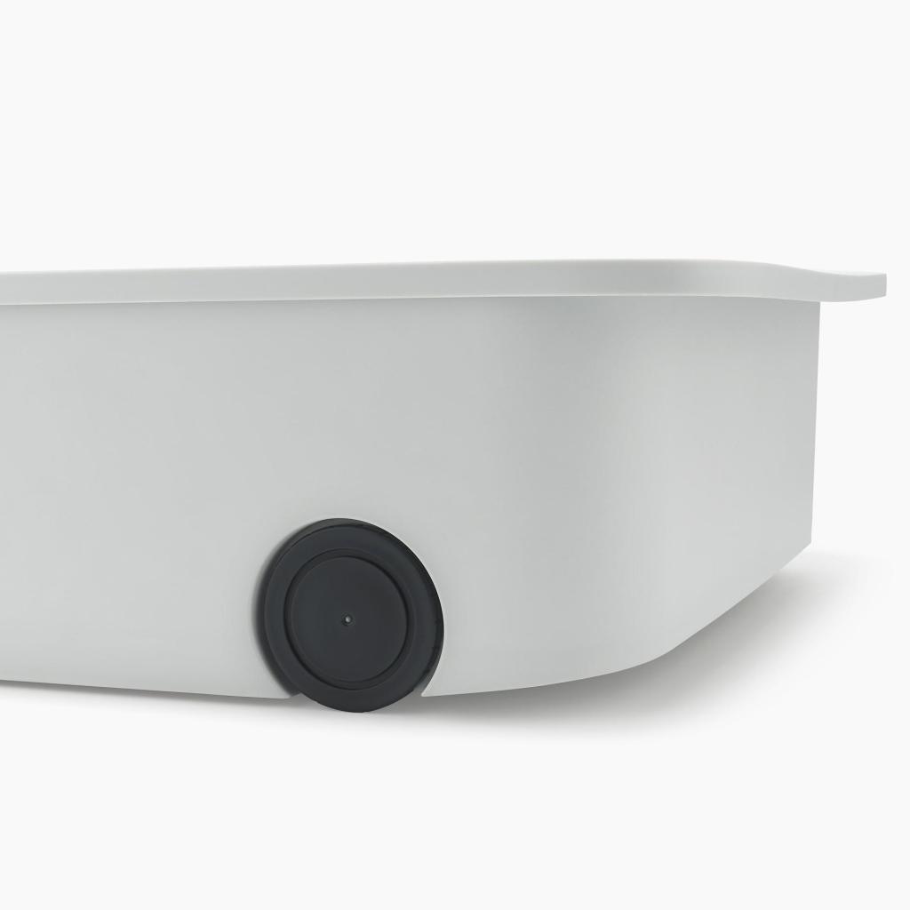- Kolečka na spodní části zajišťují plynulý pohyb organizéru po polici, takže se snadno vysune i z hlubších kuchyňských skříněk.