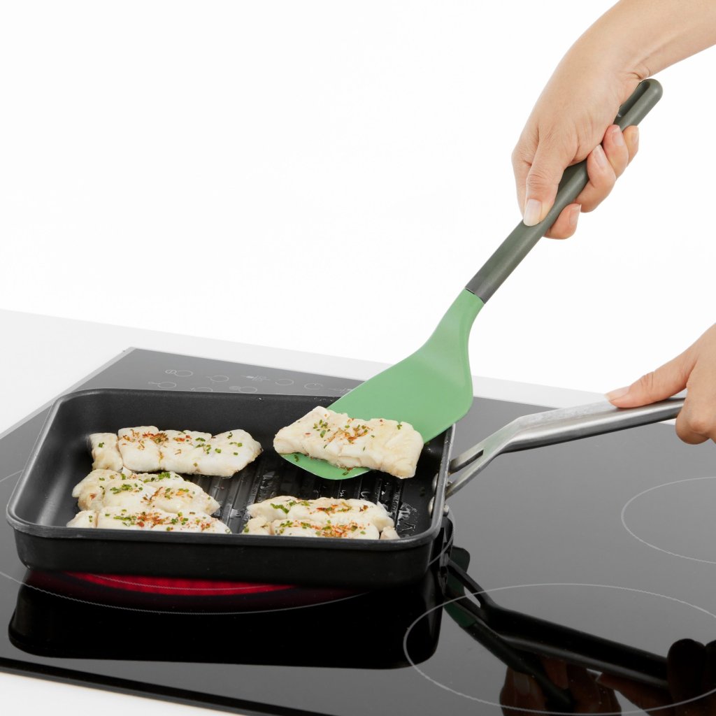 - rukojeť z PBT (tuhý a hygienický materiál) odolává až 180°C, takže náčiní může při vaření ležet na horkém povrchu jako je např. okraj hrnce