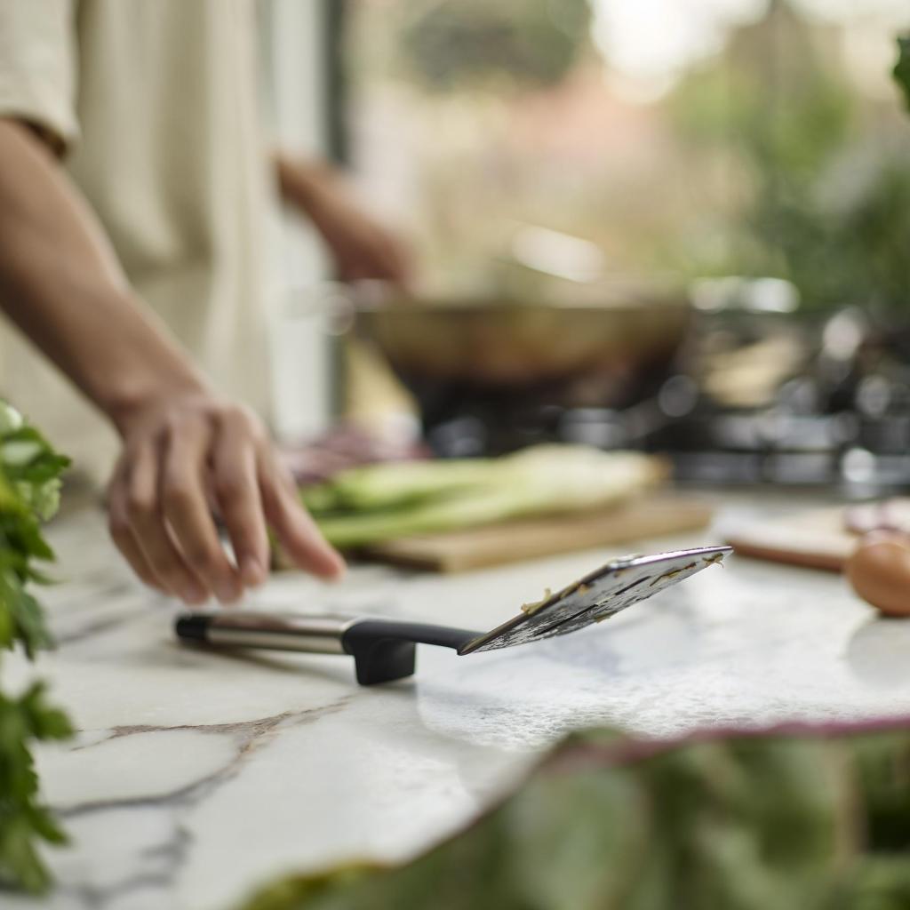 - Technologie Elevate udržuje pracovní část nástroje nad pracovní plochou, takže při odložení zůstává kuchyňská linka čistší.