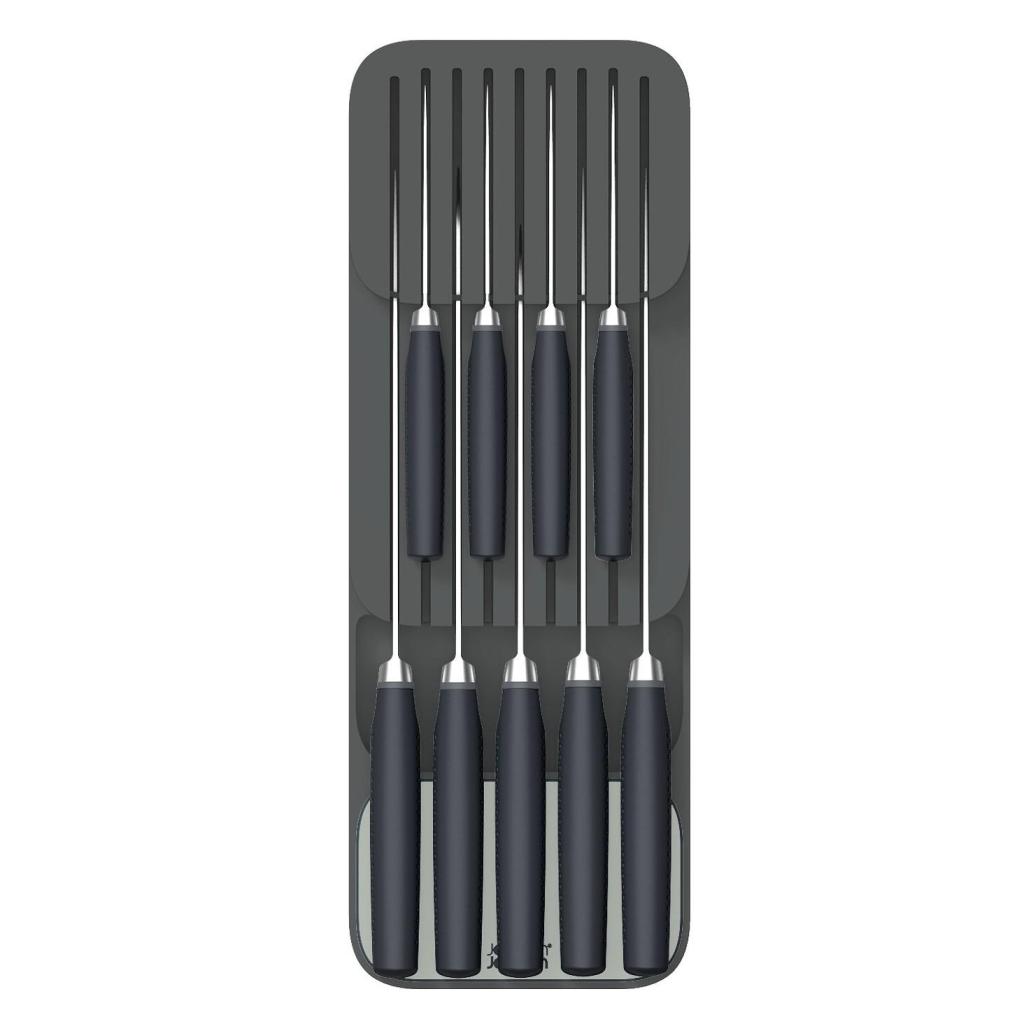 - Organizér na nože do zásuvky Joseph Joseph DUO je praktické řešení pro bezpečné a přehledné uložení kuchyňských nožů přímo v zásuvce bez zbytečného zabírání místa na pracovní desce.