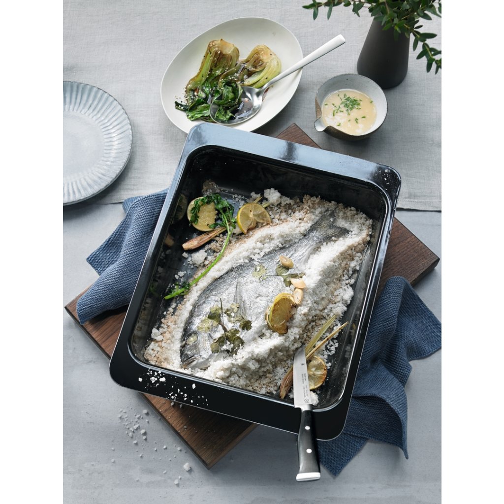 V tomto vysoce kvalitním pekáči značky WMF můžete péct, zapékat i grilovat. Pekáč z kolekce praktického nádobí Fusiontec má železo-ocelová jádro, které optimálně vede a udržuje teplo. Materiál Fusiontec je maximálně odolný (teplotně až do 450 °C), zaručuje dlouhou životnost a skvělé vlastnosti při používání. Pekáč můžete mýt v myčce na nádobí. Díky skleněnému víku můžete stav pokrmu kontrolovat v průběhu pečení, aniž byste museli víko sundávat.
