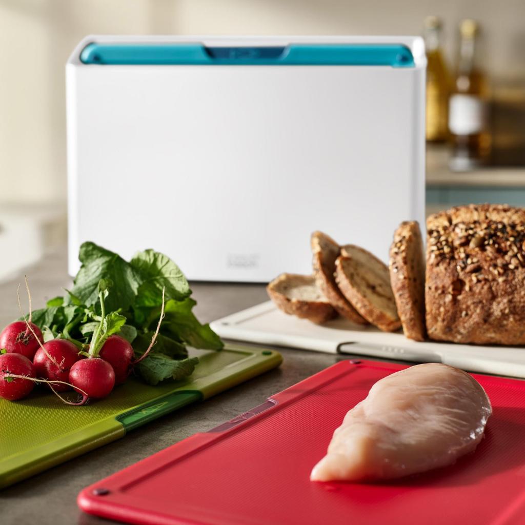 - Každé prkénko je barevně odlišeno a doplněno ikonou znázorňující typ potraviny, takže při vaření snadno vyberete správné prkénko pro konkrétní ingredience.