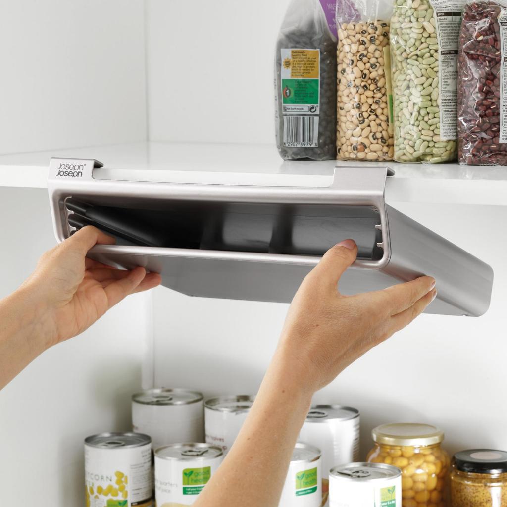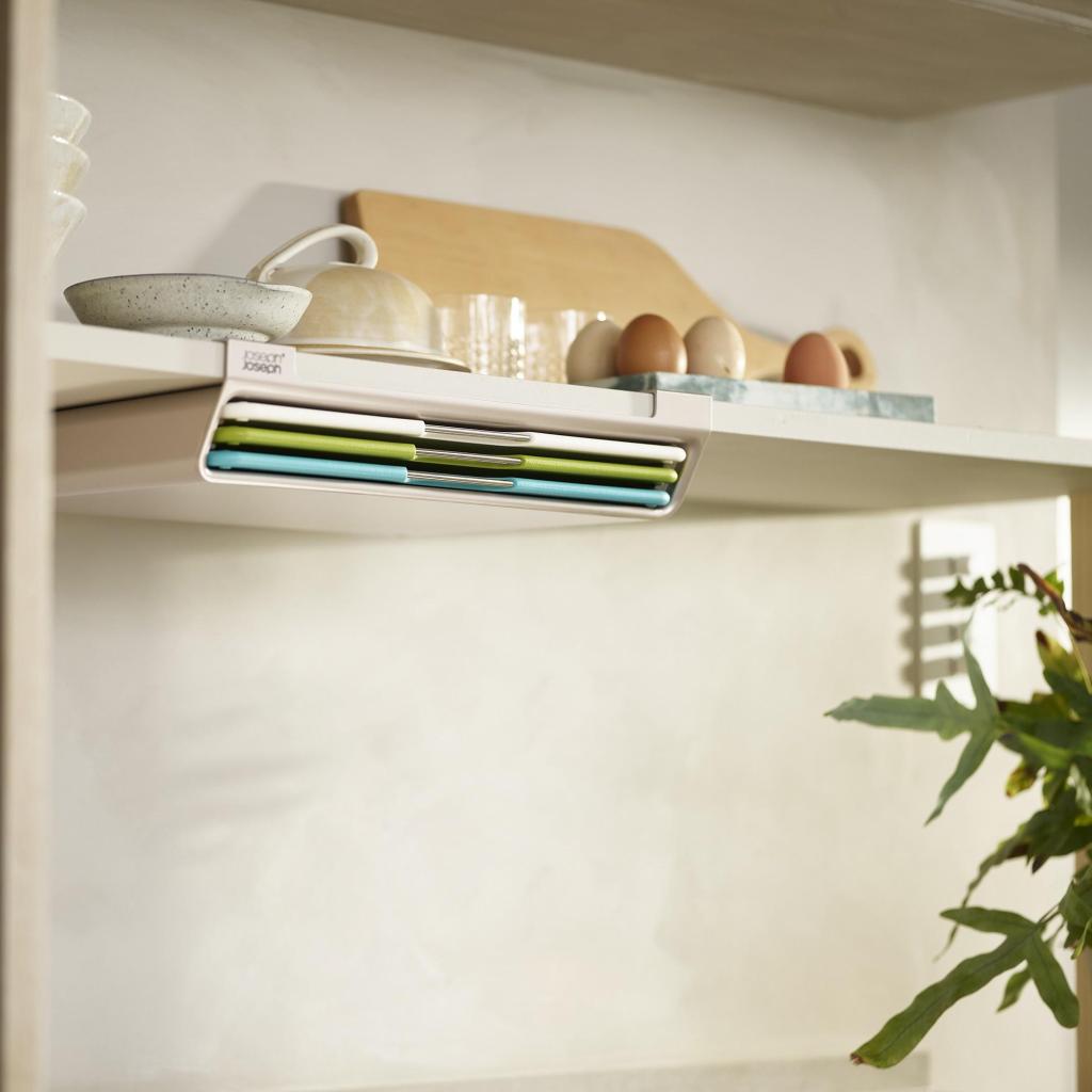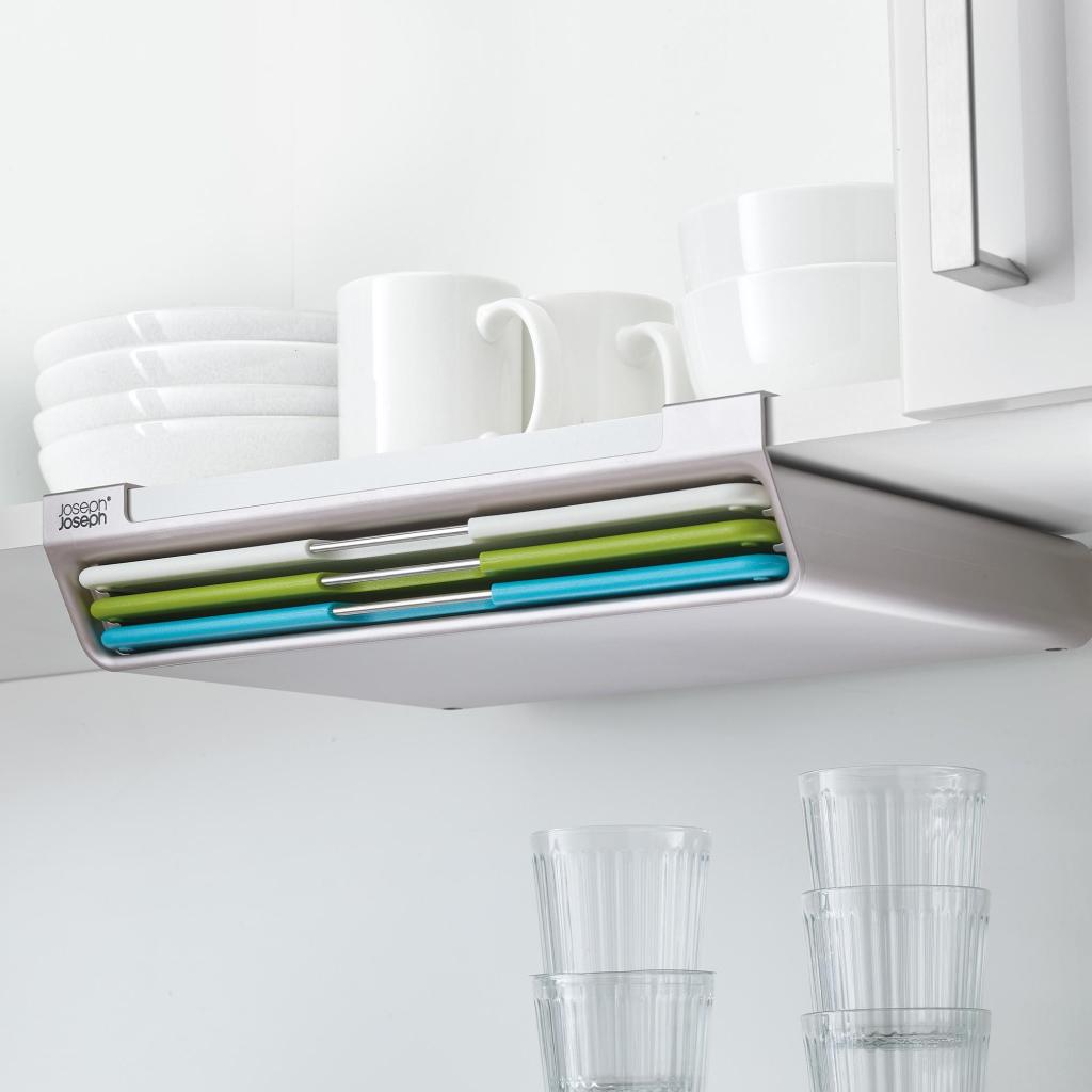 - Speciální konstrukce úložného držáku využívá nevyužitý prostor pod policí, díky čemuž můžete prkénka skladovat mimo pracovní plochu a mít je stále snadno po ruce.