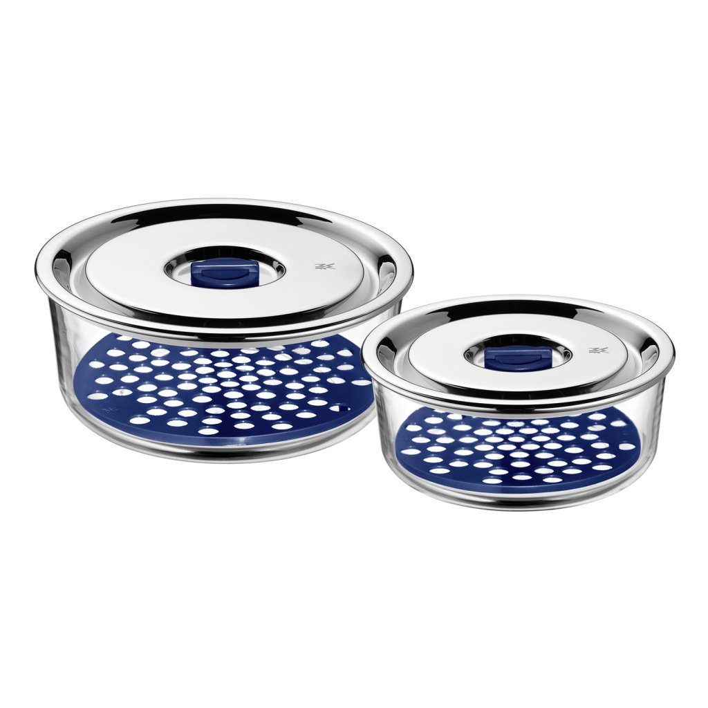 V miskách sady Top Serve ⌀ 15/18 cm je obsah neprodyšně uzavřen, proto Vaše potraviny zůstanou vždy čerstvé a chutné. Ve skleněných miskách můžete připravovat a servírovat sýry, saláty, předkrmy nebo dezerty. Po jídle je stačí zavřít a dát do lednice. Skleněná dóza i víko z Cromarganu® (ušlechtilá nerezová ocel 18/10) jsou hygienické, neabsorbují chuť a lze je mýt v myčce nádobí. Díky odkapávací mřížce se udržují potraviny při skladování v suchu a déle čerstvé.