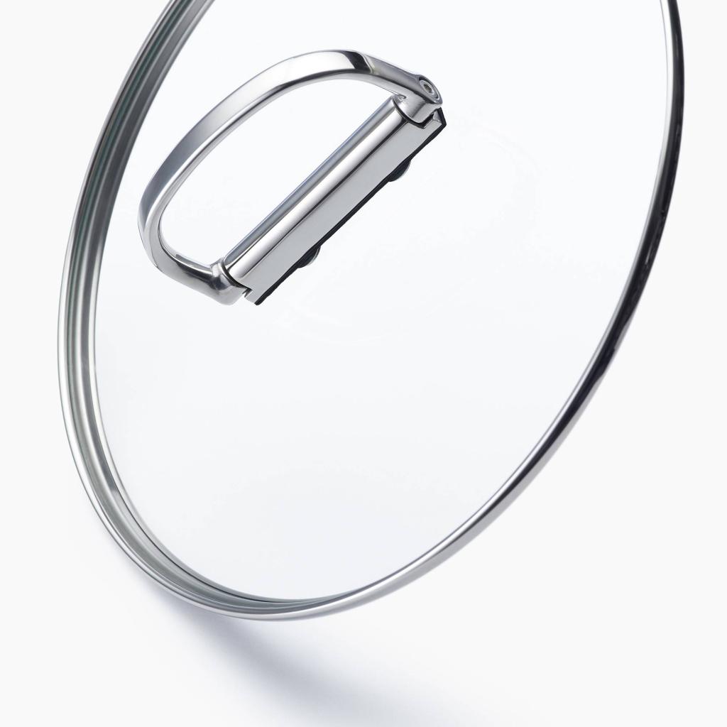 - Poklice jsou vyrobeny z tvrzeného skla s nerezovým okrajem a sklopnými nerezovými úchyty pro ještě úspornější skladování.