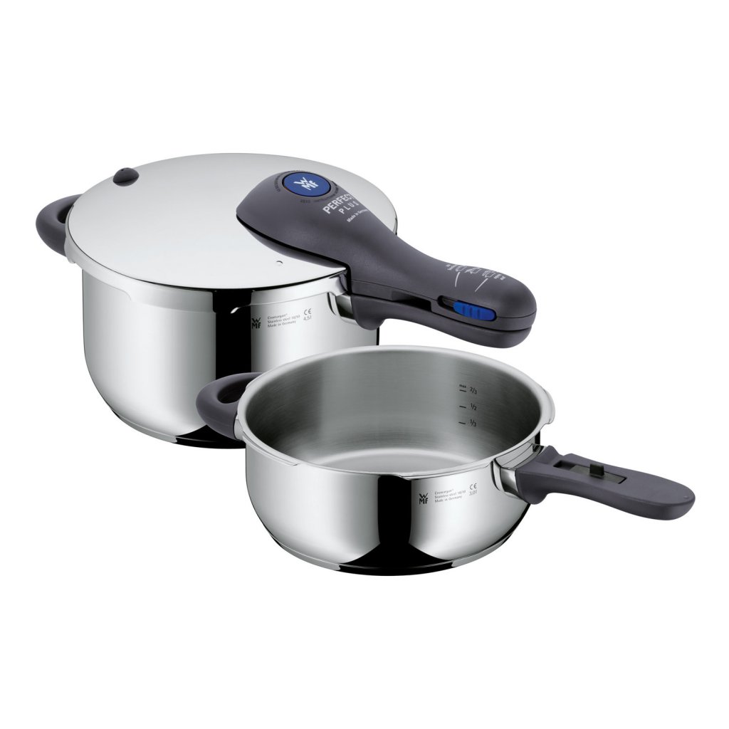 Výhodou tlakových hrnců WMF je také použití univerzálního dna TransTherm®, které je vhodné na všechny druhy tepla včetně indukce. Dno rychle absorbuje teplo a rovnoměrně ho pak přenáší na připravovaný pokrm. Doba vaření v tlakovému hrnci je oproti běžnému způsobu vaření až o 70 % kratší, což je šetrné k vitamínům a minerálním látkám. Současně šetří Váš čas a až 50 % elektrické energie. Navíc díky speciálním vložkám můžete v tlakových hrncích vařit i několik potravin najednou.