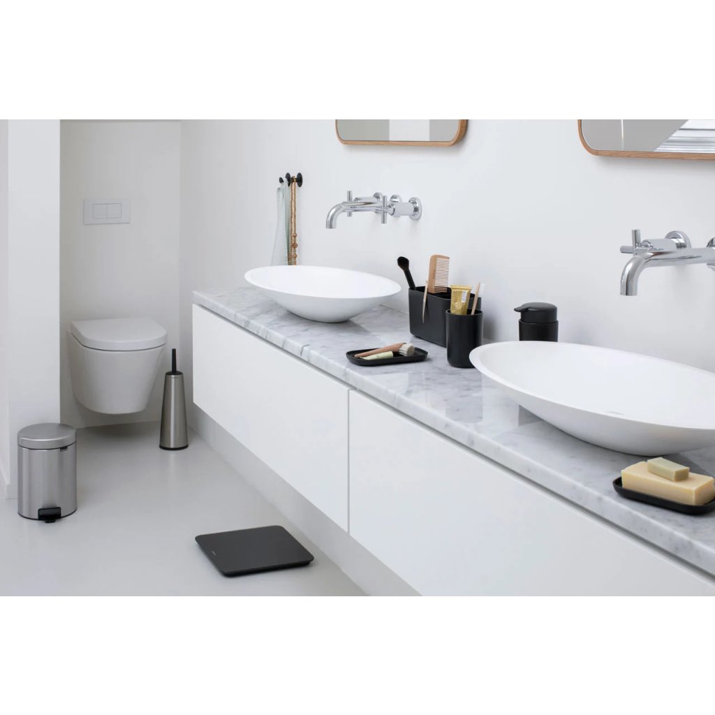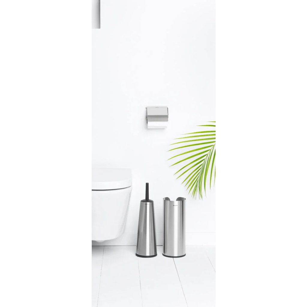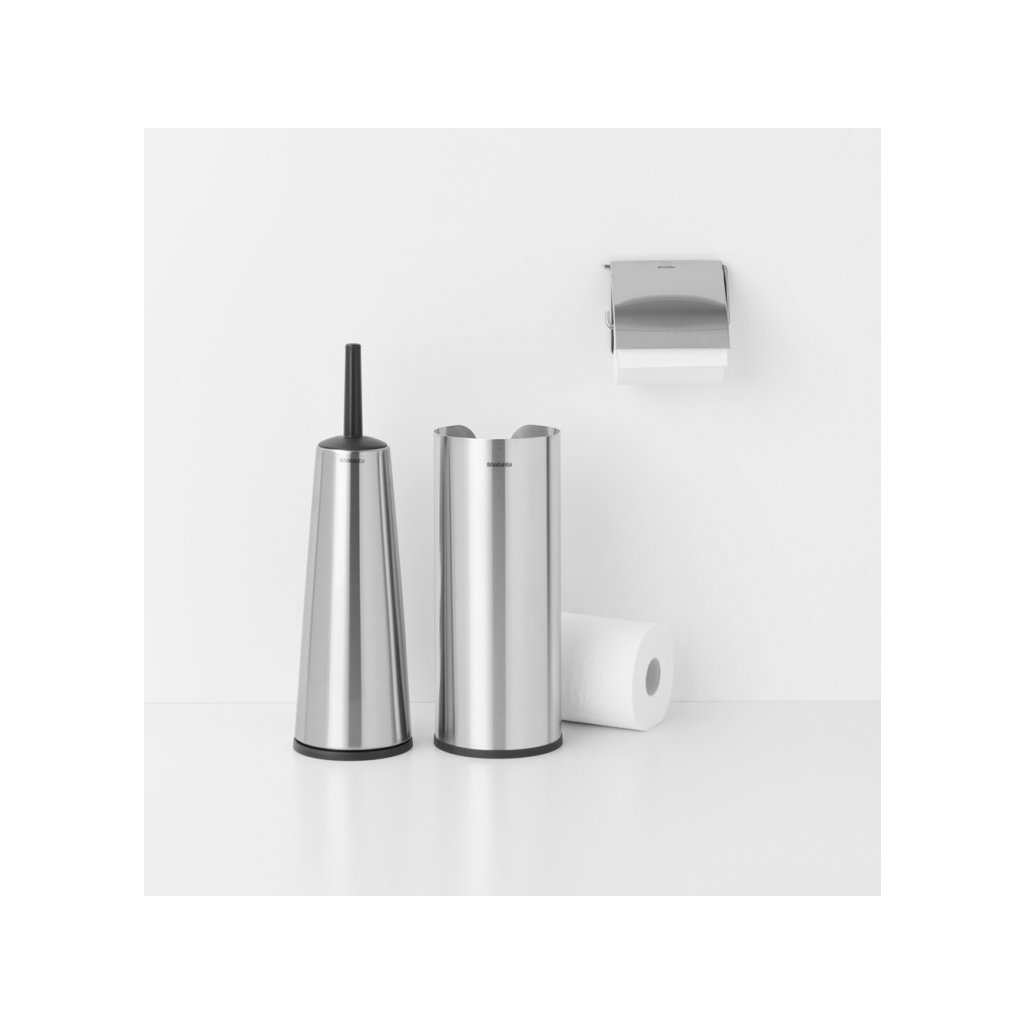 Sada toaletních doplňků začíná silným a hygienickým toaletním kartáčem a držákem. Následuje minimalistický držák toaletního papíru, který chrání toaletní papír před prachem a usnadňuje vytahování papíru z role, a jako poslední v sadě je zásobník toaletního papíru, který diskrétně drží až tři role. Vše, co potřebujete, abyste si vybavili toaletu.