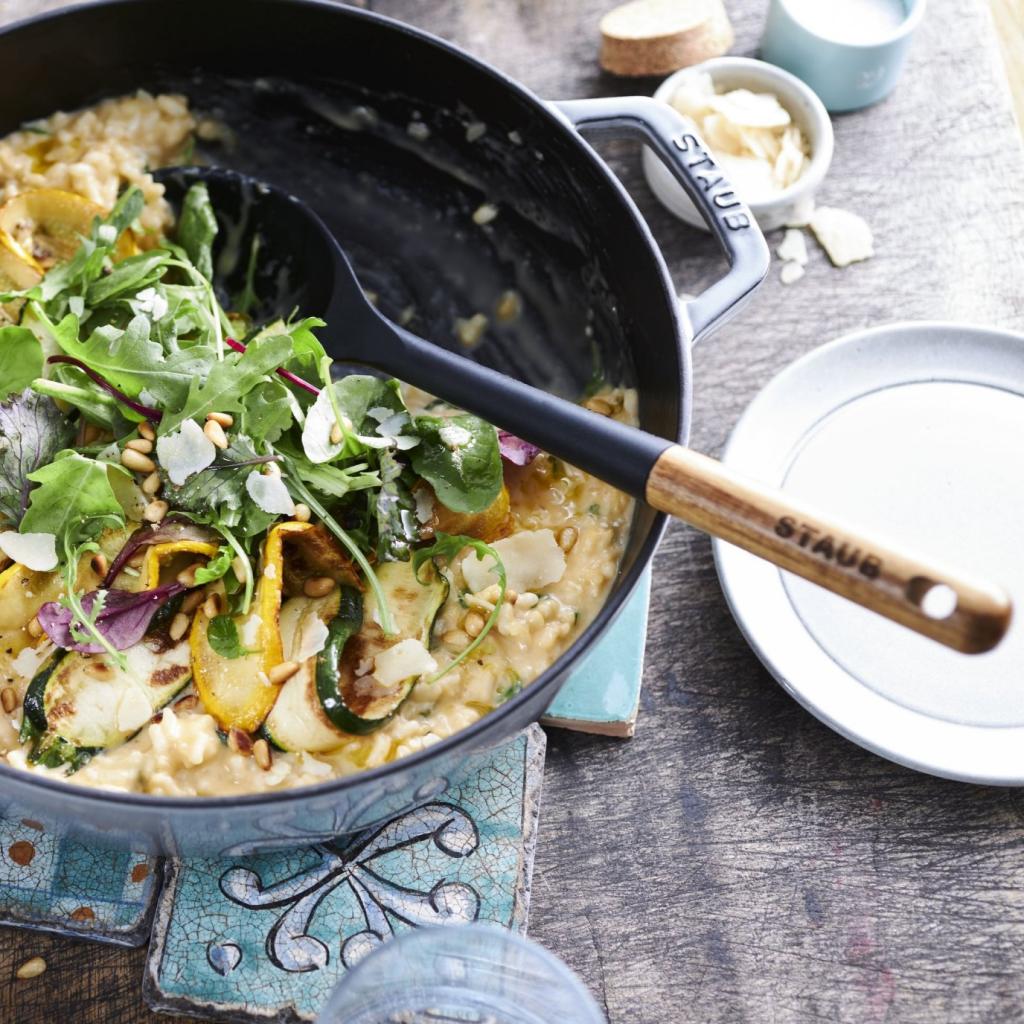 Francis Staub založil svou společnost v roce 1974 v Alsasku, východním regionu Francie, který je znám svou bohatou gastronomickou historií. Odlévané smaltované železo je pak tradiční a vysoce odolný materiál, který najde využití především při dlouhém vaření. Výborně totiž udržuje teplotu a zajišťuje její rovnoměrnou distribuci. Nádobí Staub je smaltované po obou stranách a vyrábí se přímo ve Francii ve třech výrobních závodech. Je vhodné jak pro profesionální kuchaře, tak pro začátečníky, kteří rádi objevují chutné a zdravé pokrmy. A kromě již legendárních hrnců nabízí Staub širokou paletu litinového nádobí jako kastroly na soté, grilovací pánve, tajine, woky.