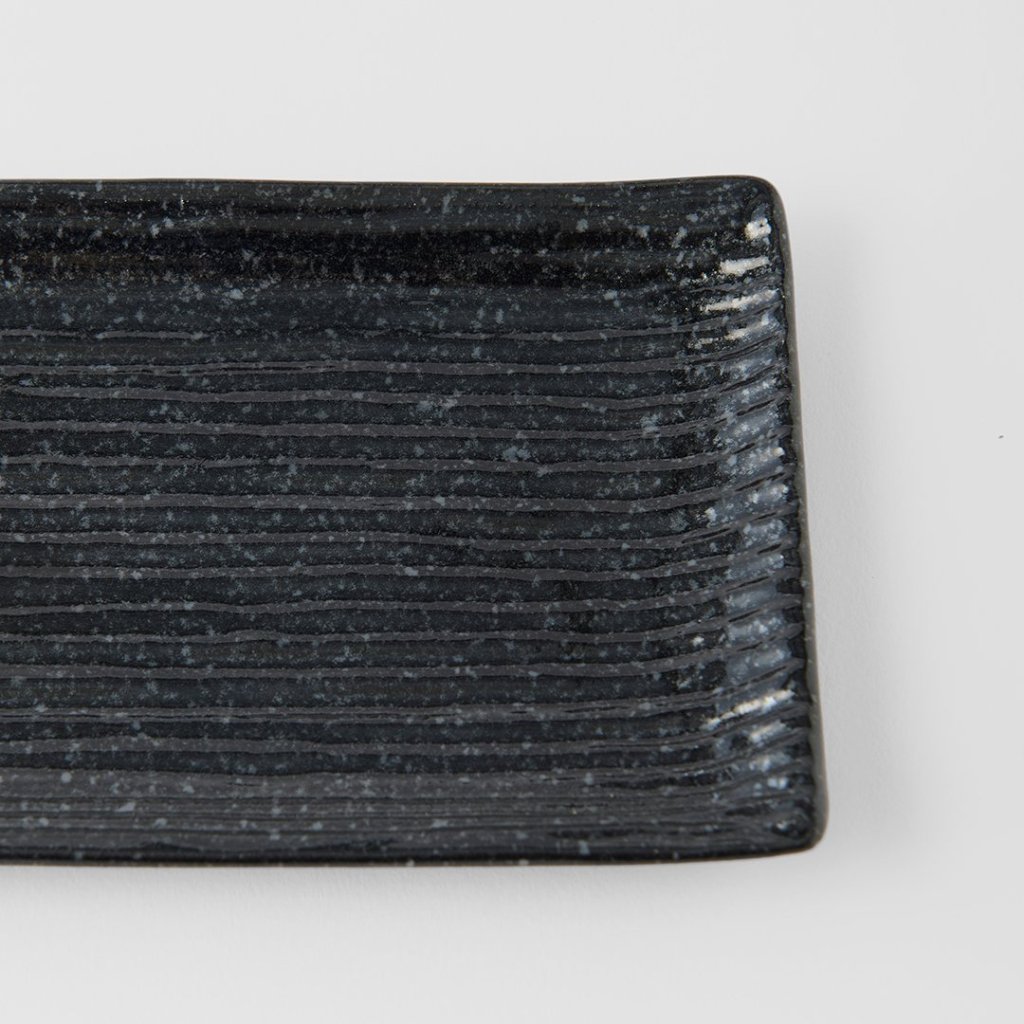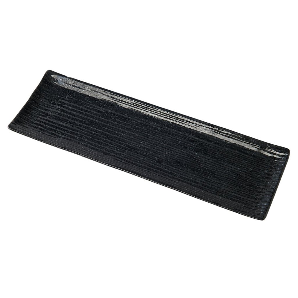 - černý obdélníkový talíř na sashimi nebo sushi
