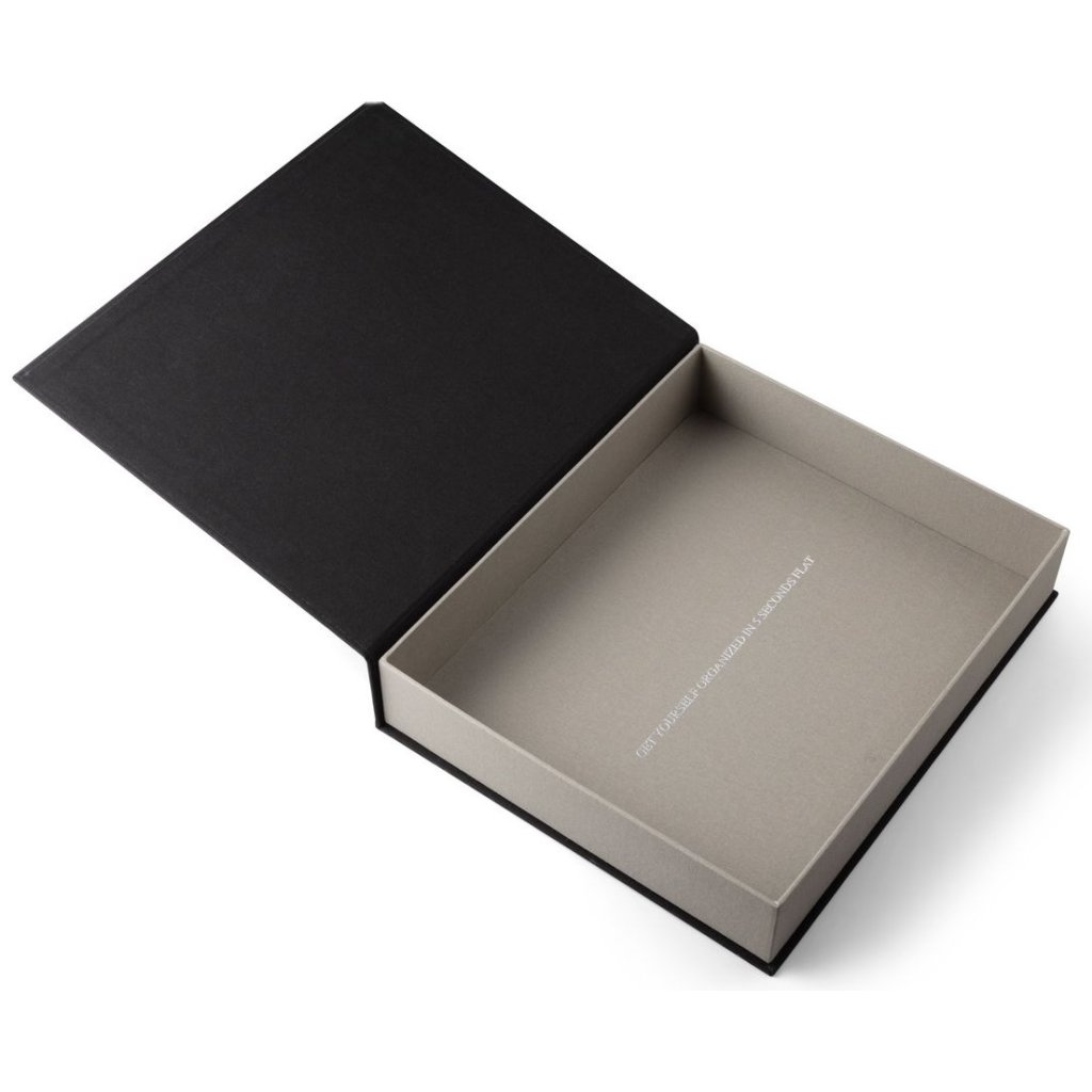 Krabička v nadčasové, elegantní černé barvě, kterou využijete na drobné nahodilé věci, které vám neustále zahlcují pokoje, může sloužit jako schránka na klíče, doklady a mince nebo jako box na šperky v moderním minimalistickém interiéru. Vnější strana krabice je pokryta látkou a vypadá jako umělecké album s vyraženými písmeny v kontrastní bílé barvě na přední straně obalu. Jsme si jisti, že si zamilujete způsob, jakým můžete uklidit svůj stůl nebo poličku za méně než 10 sekund.